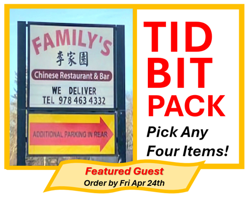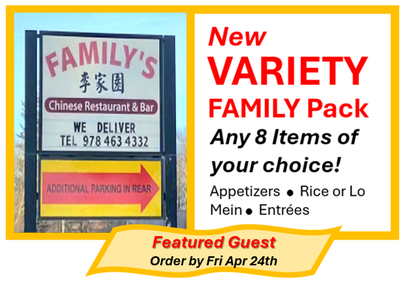 Each FAMILY PACK includes a Pu Pu Platter for two, plus lots of choices: choice of two more Appetizers, choice of any type of Rice or Lo Mein, and choice of two Entrees … enough to feed up to 8 hungry people!